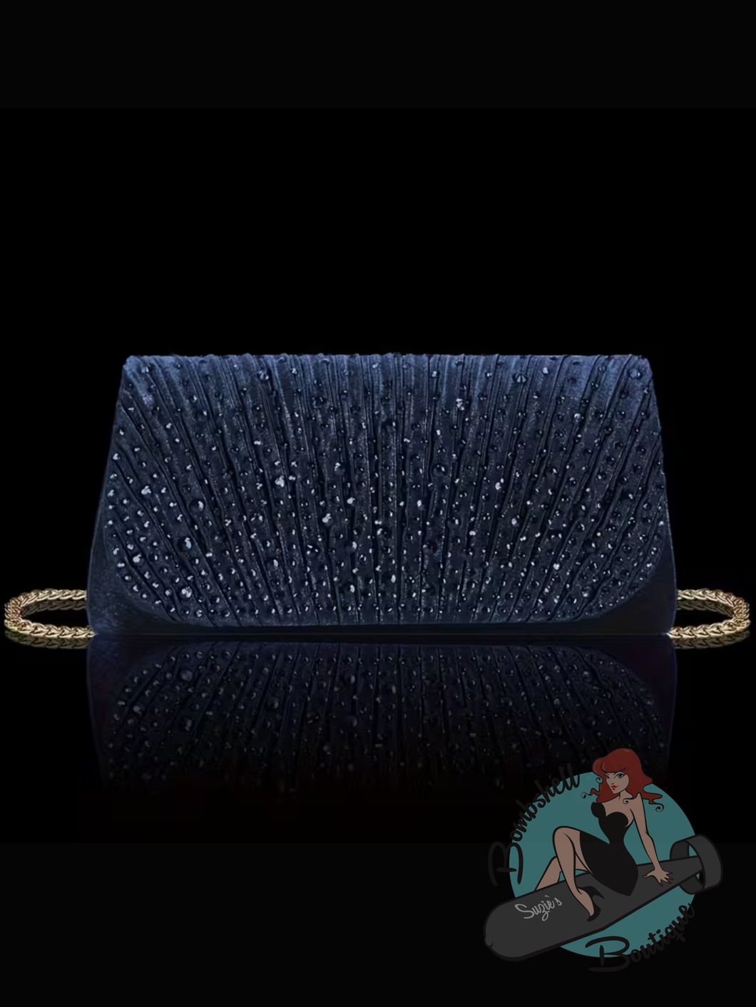Make a sparkling entrance with this fabulous rhinestoned clutch! This sophisticated bag features a pleated satin front adorned with glittering rhinestones that absolutely dazzle. The sleek clutch silhouette adds understated elegance to your Old Hollywood Glamour look while offering functionality with the detachable goldtone chain shoulder strap and just the right amount of space for your essentials. The perfect purse to complete your red-carpet-ready vintage pinup aesthetic.