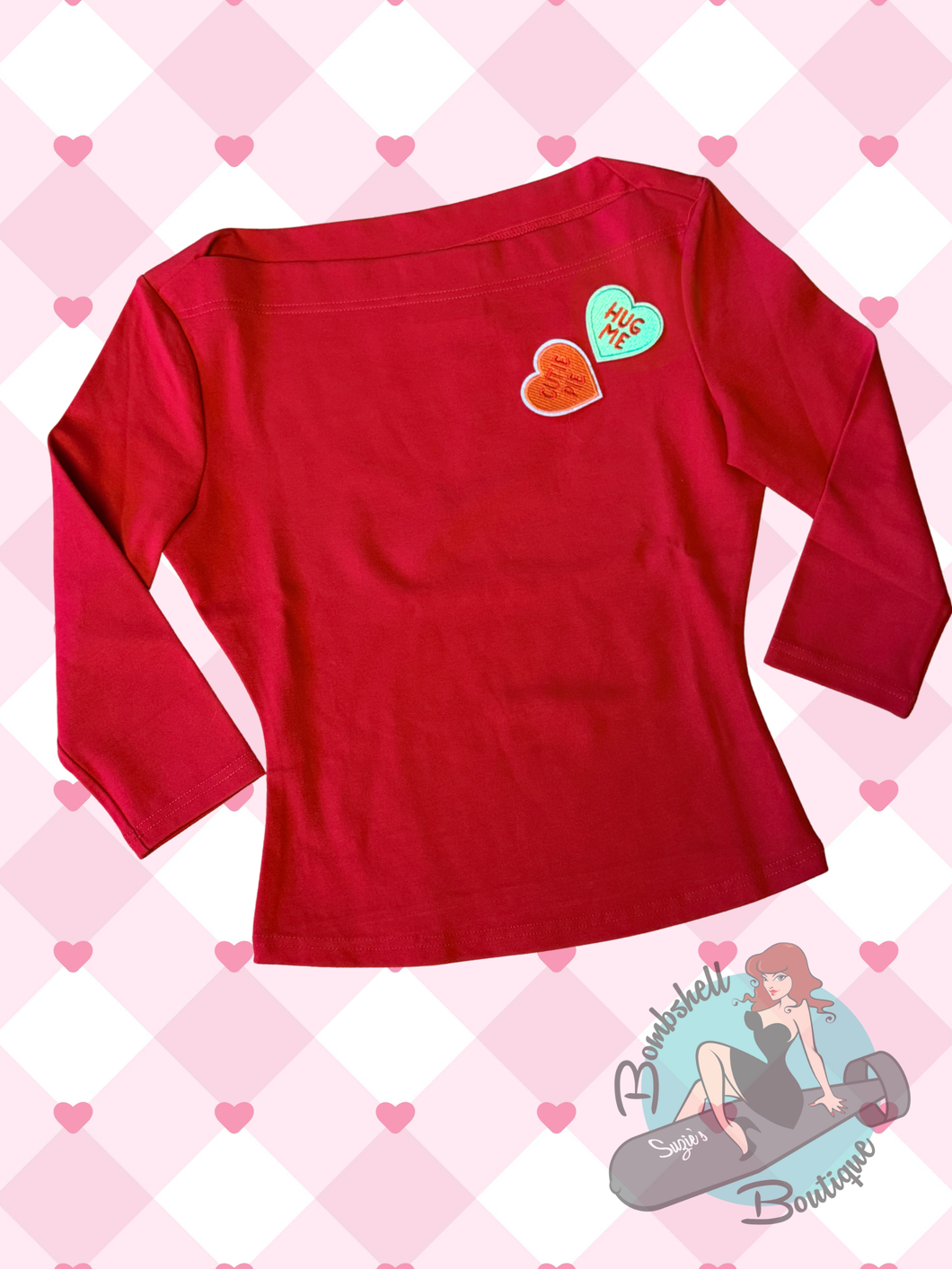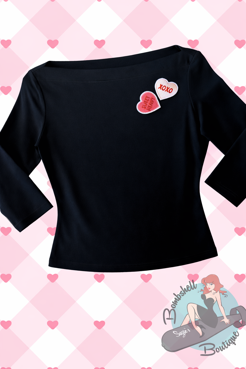 Your favourite pinup essentials top is now available with custom Conversation Heart embellishments. Available in a variety of colour and style combinations, get set to infuse some Valentine's cuteness into your everyday pinup look. This sugary sweet take on our popular, classic bateau neck top pairs perfectly with our Pippa Skirts, the new Cary Swing Skirt, or your favourite dark denim making your casual vintage inspired style as easy as taking candy from a baby (don't do that...it's mean).