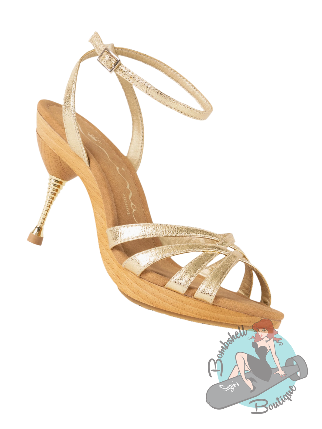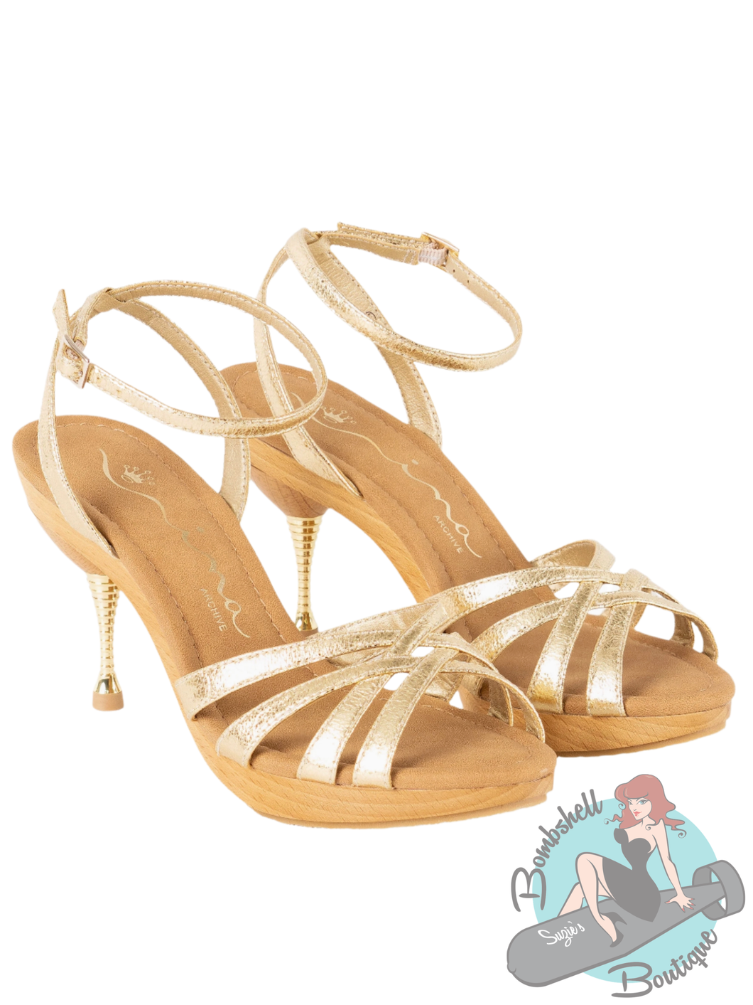 Straight out of the archives - these sparkling gold, heeled sandals take their inspiration from original 1950's Nina Shoe designs. The adjustable ankle strap and memory foam footbed combine to create a comfortable custom fit. Vintage features abound with the faux wood platform sole and metal accent high heel, making this the perfect shoe for the pin-up girl looking to add some Old Hollywood Glamour to her vintage inspired look✨