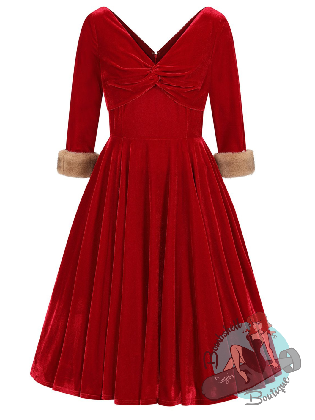 Twirl your way through party season in the Nina red velvet swing dress. The bodice features a V-neckline highlighted by a twist overlay detail, while the nipped in waist flows into the dramatic full skirt, creating the classic silhouette that every pinup girl loves. The removable faux-fur trimmed cuffs add a charming elegance that will thrill your vintage loving heart. This dress beautifully combines style and comfort to make it your new favourite party dress.