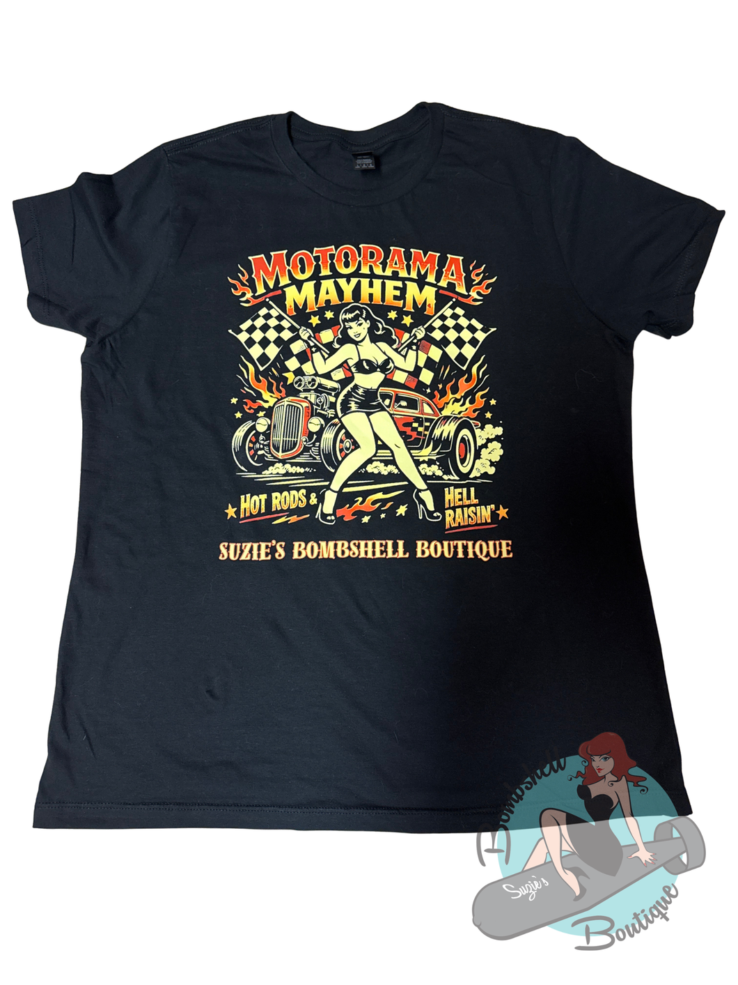 Rev your engines, the flag's about to drop with our women's classic retro tee. Featuring a bad girl rockabilly bombshell and fired up hot rod graphic, this shirt is pure adrenaline and nostalgia rolled into one. Made from 100% breathable cotton and curving in slightly at the waist, this top provides the perfect blend of comfort and femininity for your casual pin-up look. The ultimate pick for the vintage girlie gearhead who wants to wear her Mayhem attitude like a badge of honour!