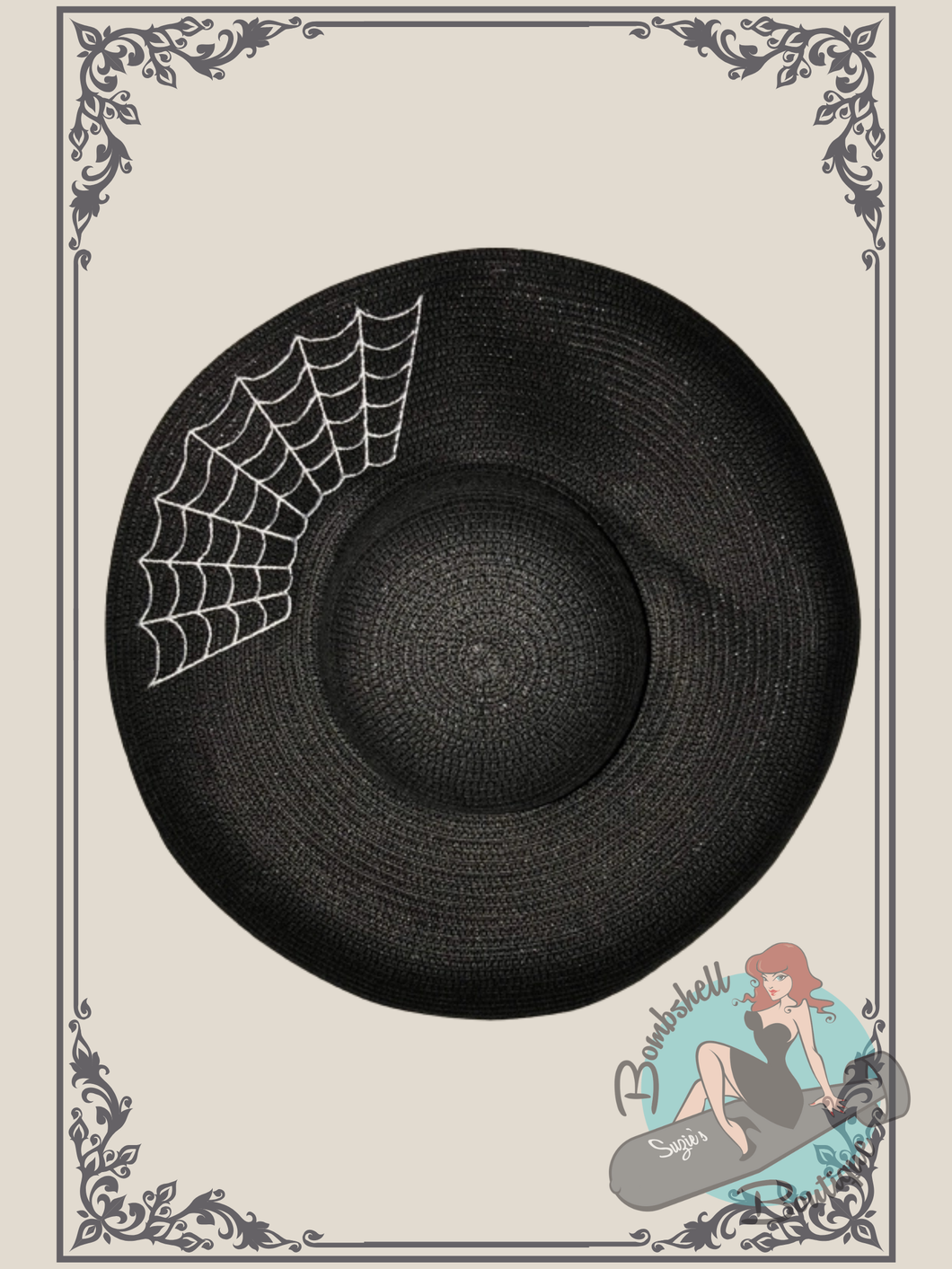 The Widow's Web Hat is the perfect accessory for those goth gals who love nothing more than long, romantic strolls through haunted graveyards. Add some spooky drama to your goth pin-up look with this statement piece featuring custom embroidered spiderweb design on a large 6" brim.