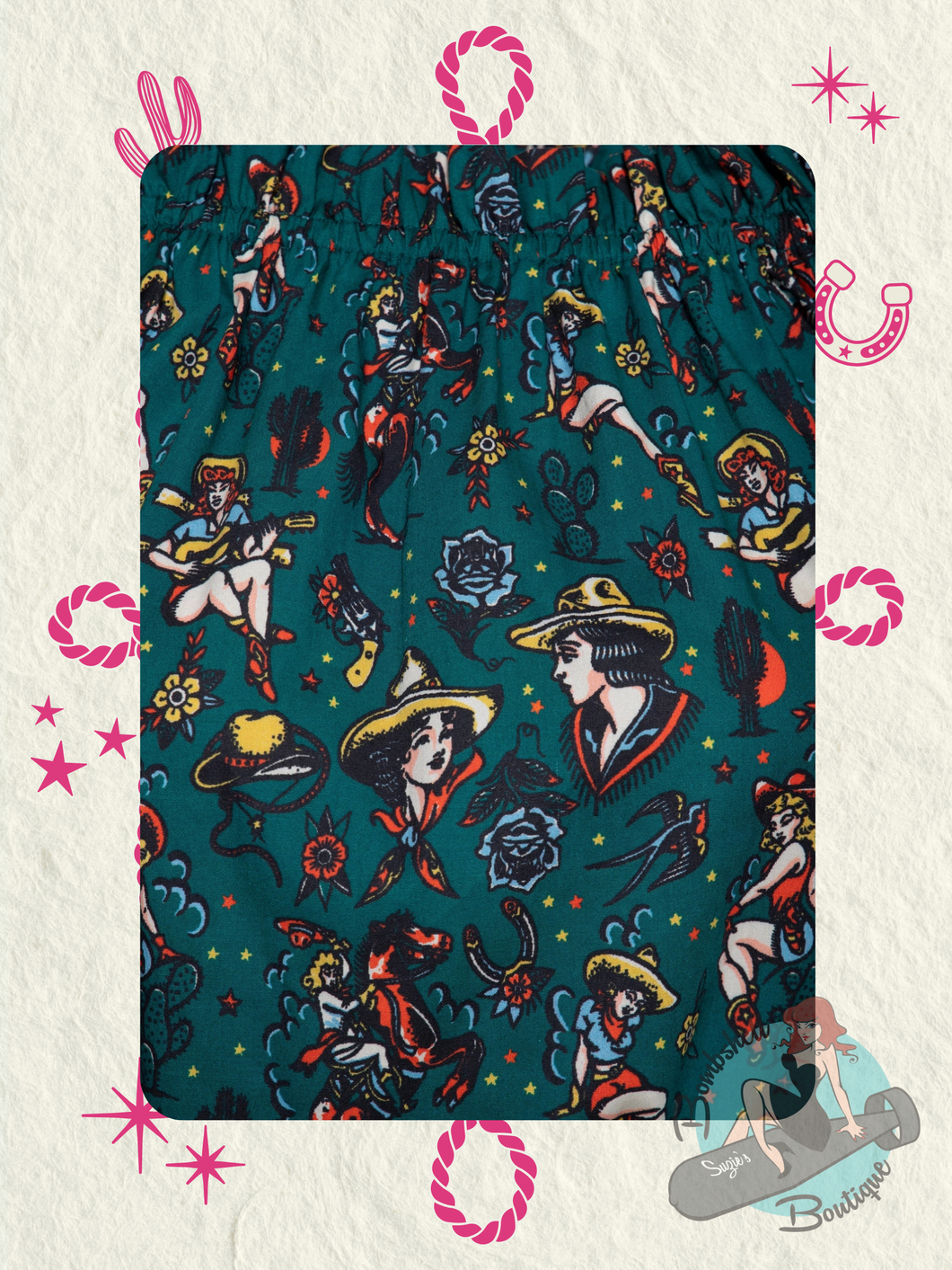 Saddle up in style with this Queen Kerosin Carmen Blouse—a dark green stunner featuring bold vintage western cowgirl imagery rendered in classic tattoo art. The elasticated neckline lets you rock it on or off the shoulder for maximum versatility, while the cinched waist adapts to your mood: wear it blousy and relaxed or tuck it in for a more polished vibe. Perfect for anyone who loves edgy Americana with a touch of retro rebellion.