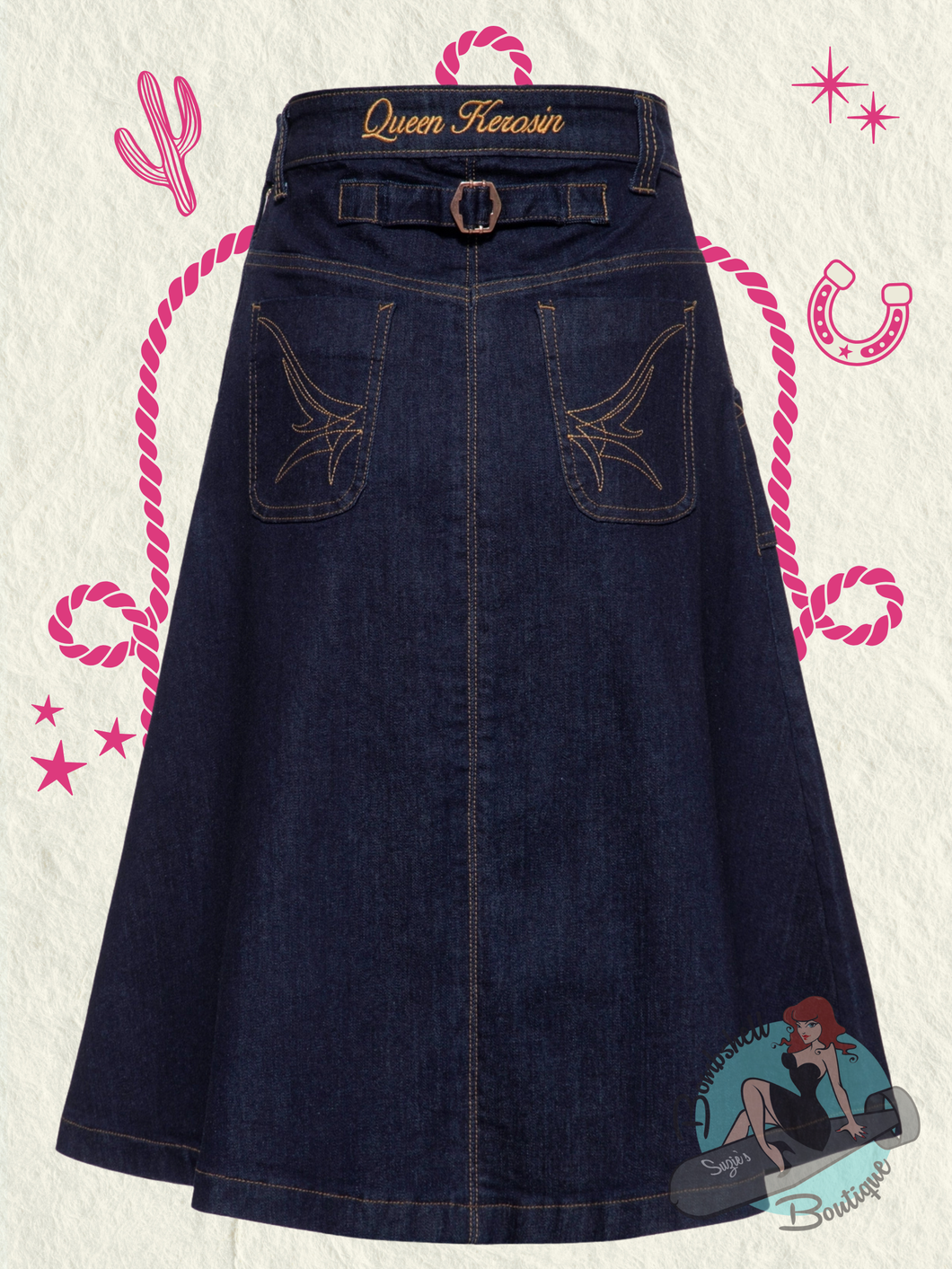 The high waist, buckle-back, A-line denim skirt is a retro loving gal's must-have piece. The Queen Kerosin Denim Swing Skirt covers all your vintage inspired casual looks, from 1950's rockabilly swagger to vintage western cowgirl. This skirt has style for days, combining everyday vintage workwear vibes with distinctive pinstripe embroidery. The dark stretch denim makes this a comfortable piece that will take you from the car show to the swing dance in style.