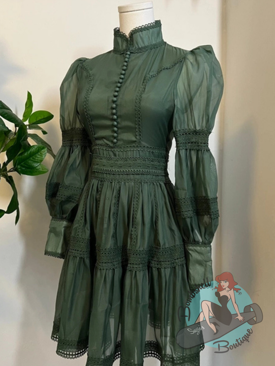 Whimsy and gothic romance meet in the Morgana Dress. This Victorian inspired knee length dress features a striking high neck, lace accents throughout, and puffed sleeves leading to dramatic three-button cuffs. The nipped-in waist flows into a dreamy lace embellished gathered skirt, creating a soft, feminine, vintage silhouette that will make your heart swoon. Â
